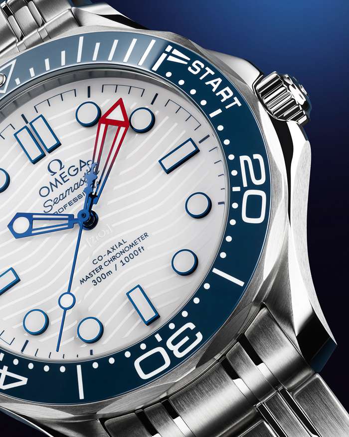 The 42 mm Seamaster Diver 300M in stainless steel has a blue ceramic unidirectional bezel with a regatta scale, comprised of two 5-minute pre-start sections, and START section with regatta-inspired flag.