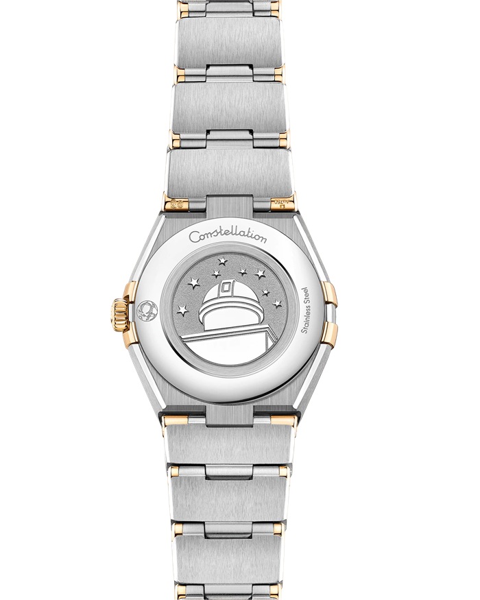 This 25 mm 18K yellow gold and stainless steel model features a bezel engraved with Roman numerals, white mother-of-pearl dial with diamond hour markers and scratch-resistant saphire crystal. The hands, OMEGA logo, Constellation star and diamond holders are also in 18K yellow gold.