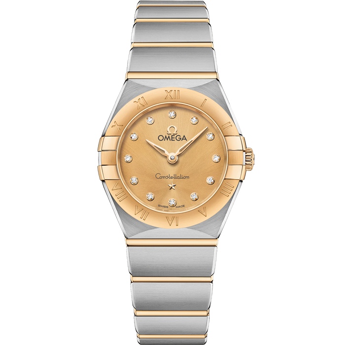 This 25 mm 18K yellow gold and stainless steel model features a bezel engraved with Roman numerals, sun-brushed champagne dial with diamond hour markers and scratch-resistant saphire crystal. The hands, OMEGA logo, Constellation star and diamond holders are also in 18K yellow gold.