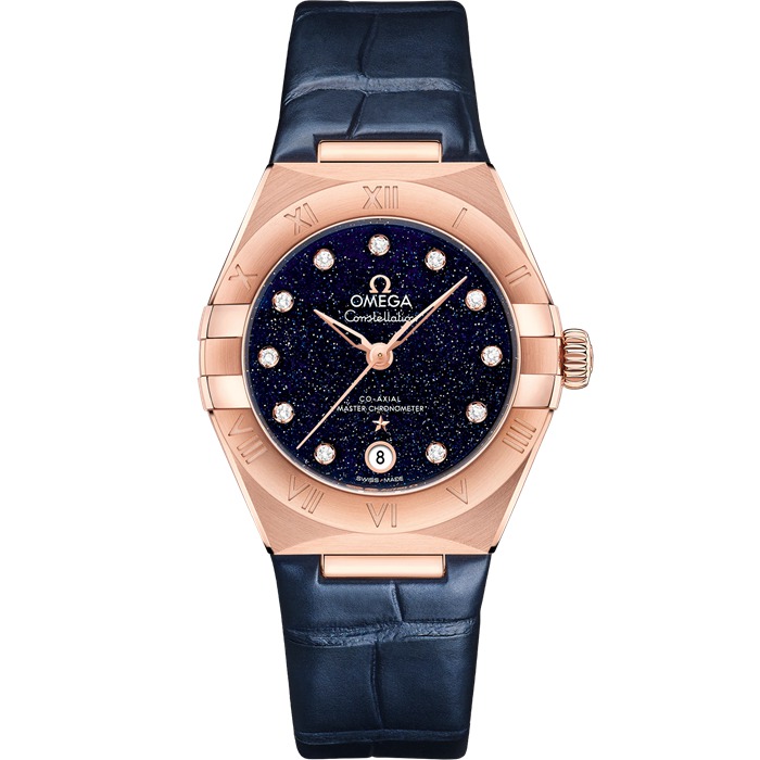 This 29 mm 18K Sedna™ gold model features a bezel with engraved Roman numerals, blue aventurine glass dial with diamond hour markers and a date window at the 6 o’clock position. The hands, OMEGA logo, Constellation star and diamond holders are also in 18K Sedna™ gold.