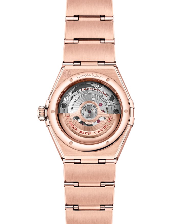The astonishing dial is formed from a genuine piece of iron meteorite, which has been given a PVD Sedna™ Gold colour treatment. The natural pattern within the meteorite is unique to each model, meaning that no two dials are ever the same. It is completed with a date window at 6H, along with diamond hour markers, and a Constellation star in 18K Sedna™ Gold.