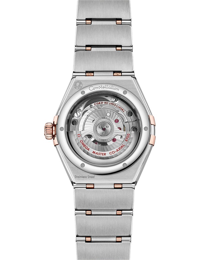 This 29 mm 18K Sedna™ gold and stainless steel model features a bezel engraved with Roman numerals, pearled mother-of-pearl dial and a date window at the 6 o’clock position. The hands, OMEGA logo, Constellation star and indexes are also in 18K Sedna™ gold.