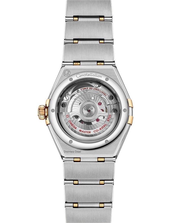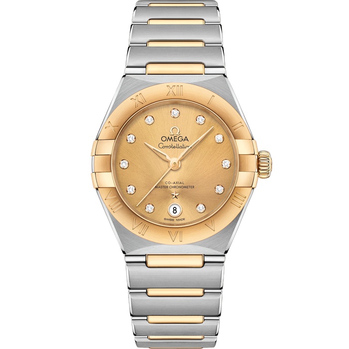 This 29 mm 18K yellow gold and stainless steel model features a bezel engraved with Roman numerals, sun-brushed champagne dial with diamond hour markers and a date window at the 6 o’clock position. The hands, OMEGA logo, Constellation star and diamond holders are also in 18K yellow gold.