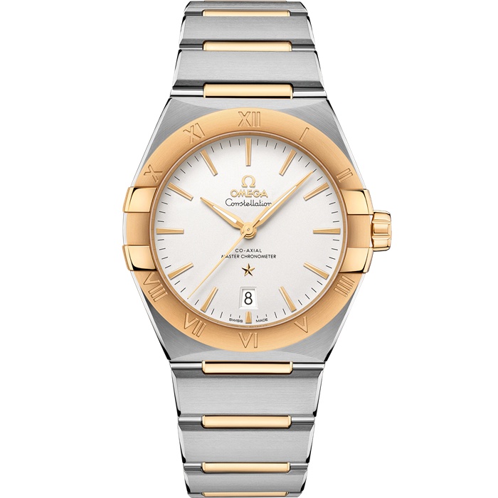 This 39 mm stainless steel and 18K yellow gold model features a bezel engraved with Roman numerals, an opaline white silvery dial and a date window at the 6 o’clock position. The hands, OMEGA logo, Constellation star and indexes are all in 18K yellow gold.