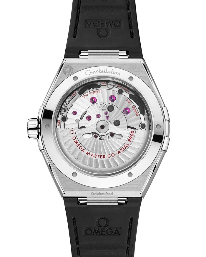 This 41 mm stainless steel model features a polished black ceramic bezel with Roman numerals in Liquidmetal™, a sun-brushed black dial and a date window at the 6 o’clock position. The hands, OMEGA logo, Constellation star and facetted indexes are all rhodium-plated.