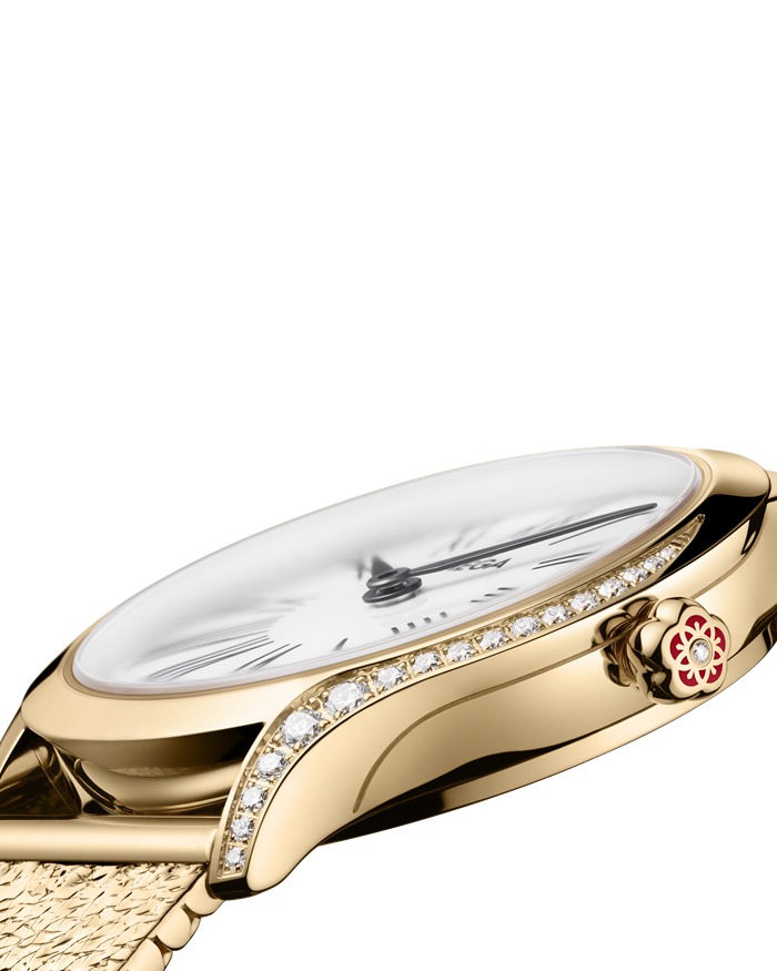 This model in 18K Moonshine™ Gold features a 26 mm case with diamonds that elegantly curve along each side. There is also a single diamond set in the crown, surrounded by a red liquid ceramic flower. The domed dial is crafted in off-white “Grand Feu” enamel and is presented with blackened hands and transferred Roman Numeral indexes.