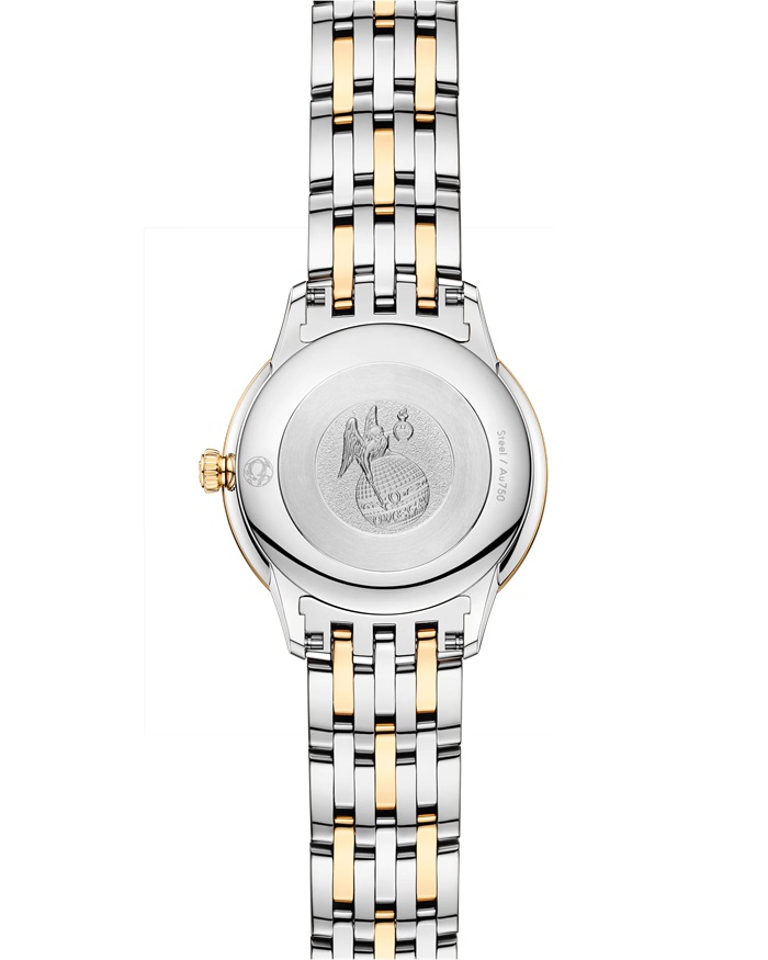 This 27.5 mm stainless steel and 18K yellow gold model features a diamond-paved bezel and a dial crafted from white mother-of-pearl. The display is distinguished by yellow gold-plated hands, as well as alternating Roman numerals and diamond markers. The pure look of the timepiece is completed by a full caseback embossed with a God Chronos medallion.