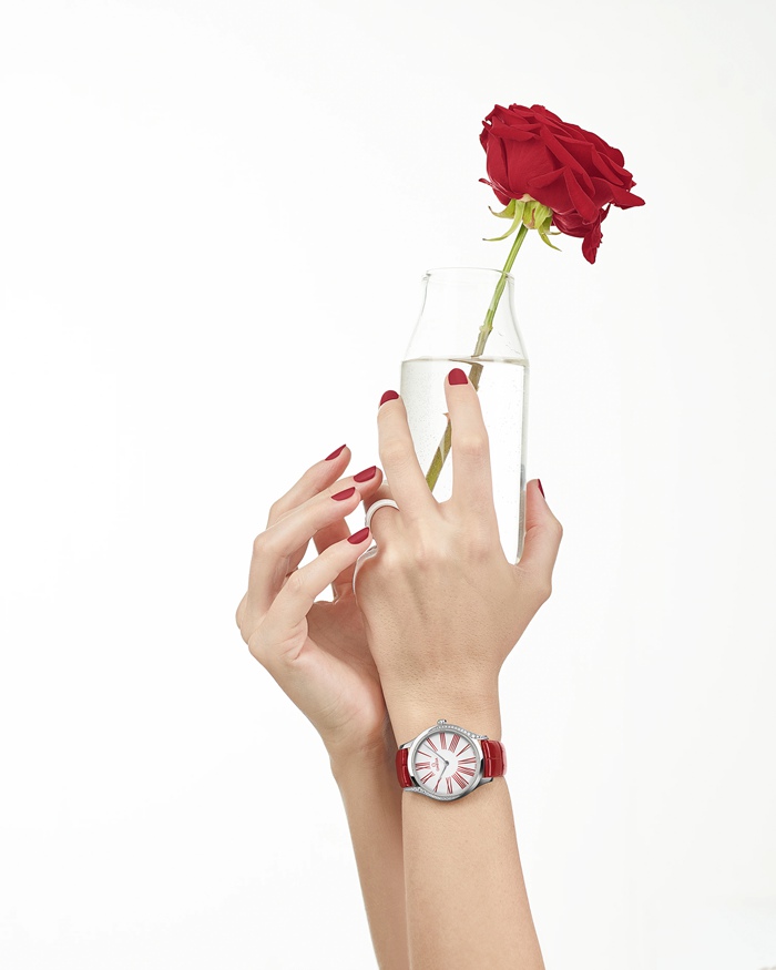 For this model, the slim 36 mm case is crafted in stainless steel and features 38 single-cut diamonds, which curve elegantly along each side. The lacquered white dial is surrounded by transferred Roman numerals in red, while the crown includes a single diamond, this time surrounded by a red ceramic flower made from five OMEGA logos.