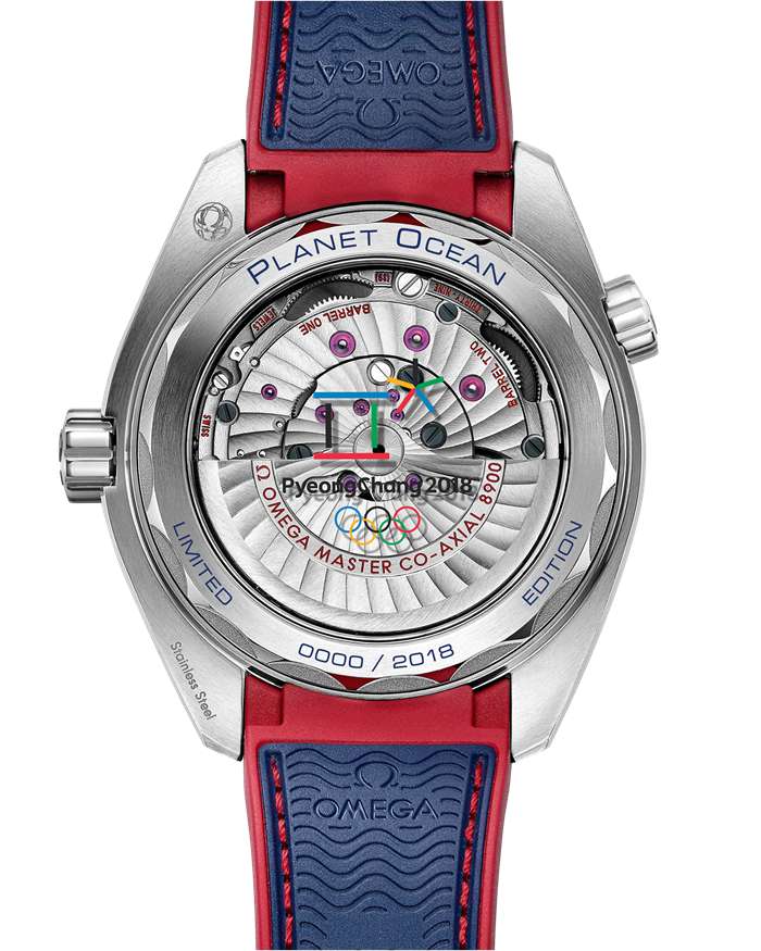 The screw-in caseback is engraved in blue with the words PLANET OCEAN and LIMITED EDITION, as well as the Limited Edition number. Transferred to the caseback’s sapphire crystal are the words “PyeongChang 2018” and the Olympic Games logo.