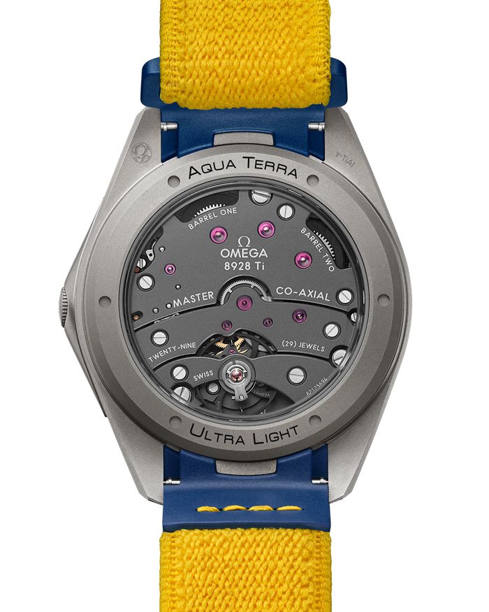For the blue anodized dial, OMEGA has used sand-blasted Grade 5 titanium, and included an engraved horizontal stripe pattern. Alongside the blackened indexes and hour-minute hands with Super-LumiNova, there is also a yellow varnished 3D laser-shaped cylindrical central seconds hand inspired by a Pole Vault.