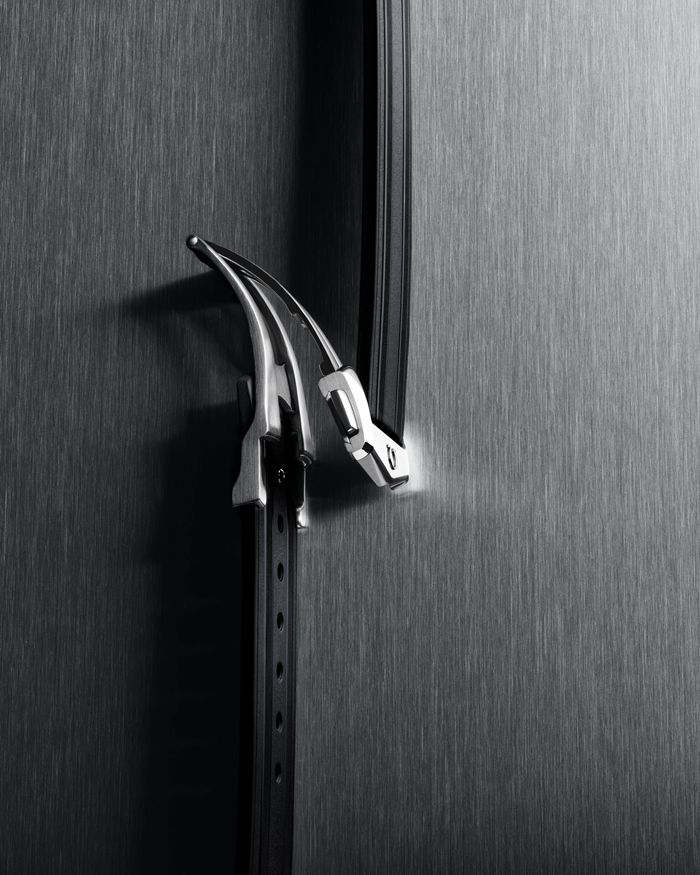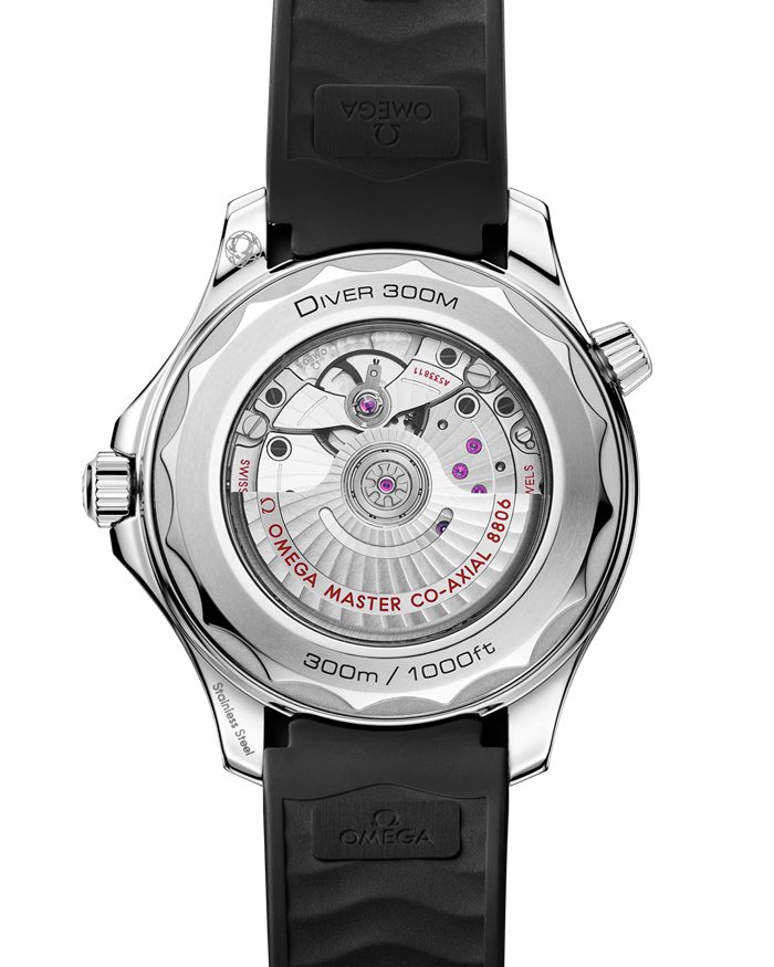 Black aluminium is also used to create the dial, which is laser-engraved with the Diver’s iconic wave pattern. The skeletonized hands and indexes are rhodium plated and filled with white Super-LumiNova, while the other markings, including the OMEGA logo, are transferred in white.