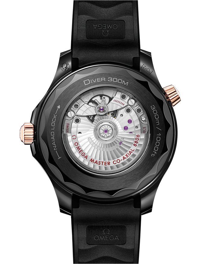 This 43.50 mm model, cased in black ceramic [ZrO2] and Sedna™ gold, has a black ceramic dial with laser-ablated waves in positive relief. The polished Sedna™ gold indexes and facetted hands, filled with white Super-LumiNova, contrast beautifully with the black dial. Completing the look is an integrated black rubber strap with black ceramic buckle.