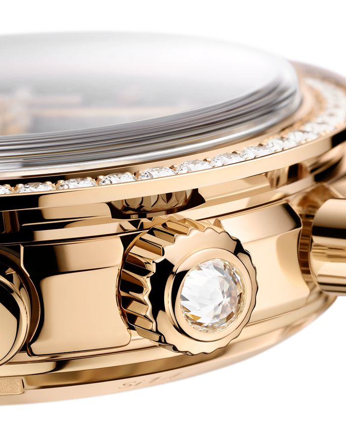 This model, cased in fully polished 18K Moonshine™ Gold, has a bezel set with 52 diamonds, and a polished crown set with a single diamond.