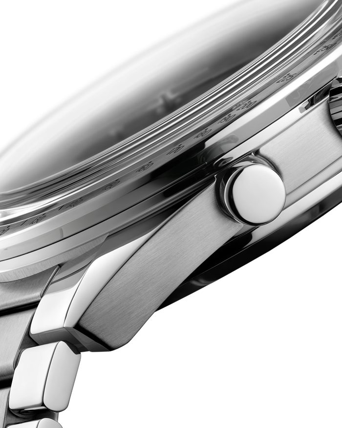 This 40.50 mm model, inspired by the legendary 1957 original, features a stainless steel case and a black dial with recessed hour markers showing vintage Super-LumiNova from beneath. Along with rhodium-plated “Broad Arrow” hands, there is a date window at 6 o’clock, a small seconds subdial at 9 o’clock, and 12-hour and 60-minute chronograph recorders on the subdial at 3 o’clock.