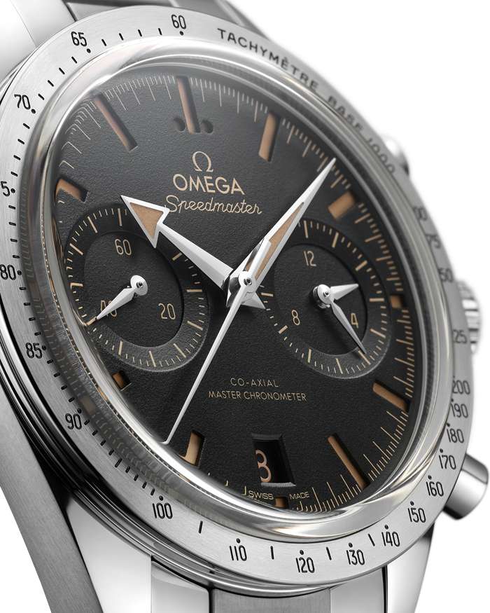 The brushed bezel includes a blackened tachymeter scale, while on the caseback, there is a “Speedmaster ‘57” engraving as well as a flat sapphire crystal with an anti-reflective treatment inside.