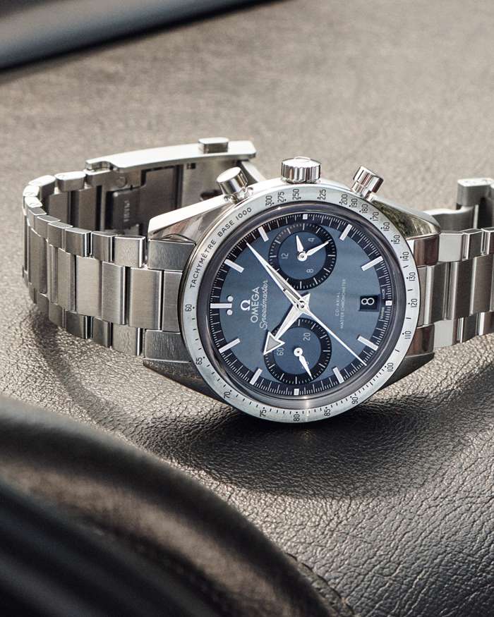 The brushed bezel includes a blackened tachymeter scale, while on the caseback, there is a “Speedmaster ‘57” engraving as well as a flat sapphire crystal with an anti-reflective treatment inside.