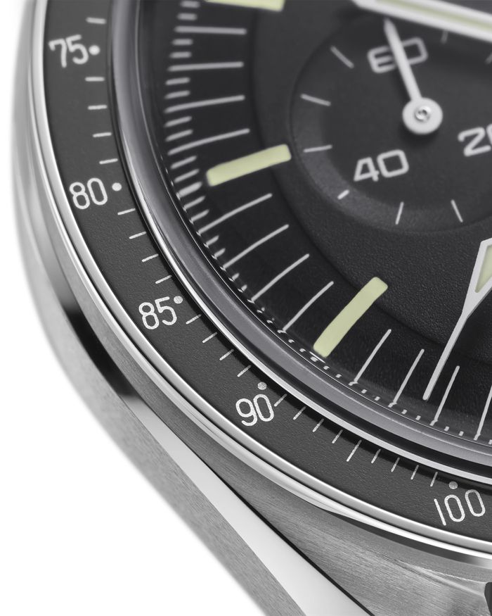 Presented on a nylon fabric strap, this 42 mm Moonwatch in stainless steel features hesalite glass on the front and an embossed Seahorse medallion on the caseback. Inspired by the 4th generation Speedmaster style worn on the moon, it also includes an asymmetrical case, black step dial and the famous dot over 90 on the anodised aluminium bezel ring.