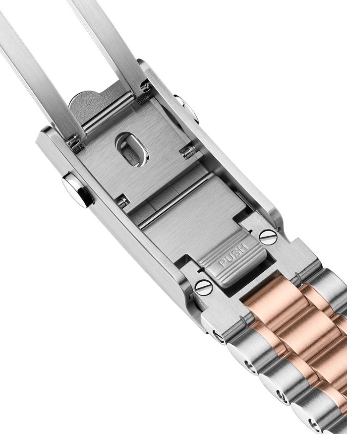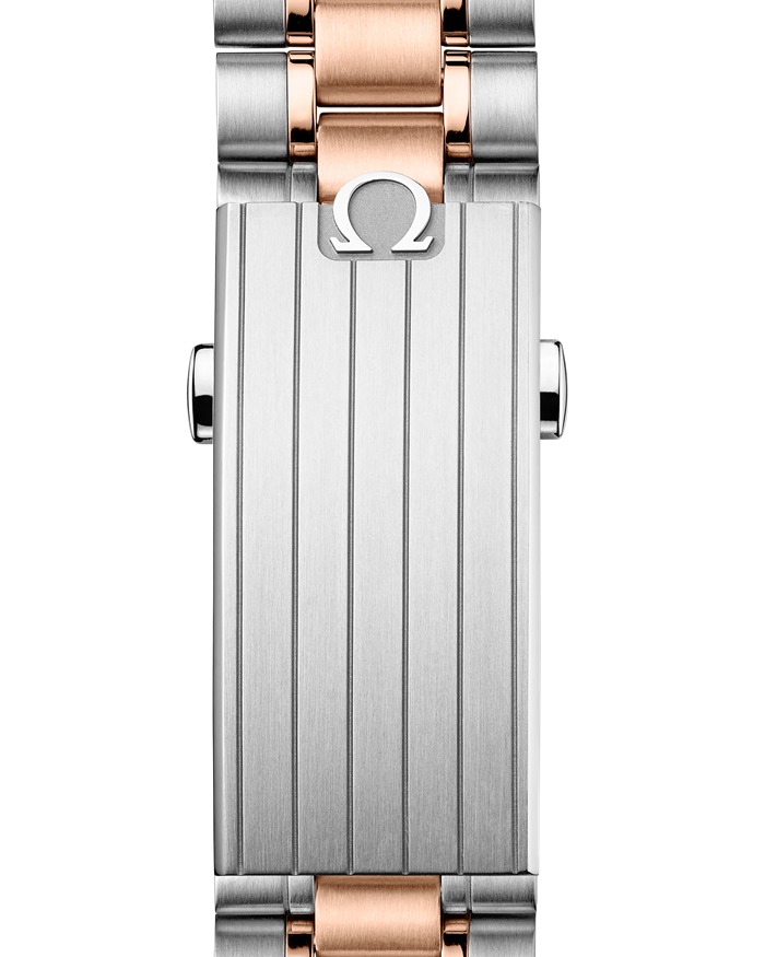 The PVD-treated 18K Sedna™ Gold “step” dial is sun-brushed and presented with applied OMEGA logo and indexes, 18K Sedna™ Gold hands, and black coated subdials including a small seconds recorder, 30-minute recorder, and 12-hour recorder.