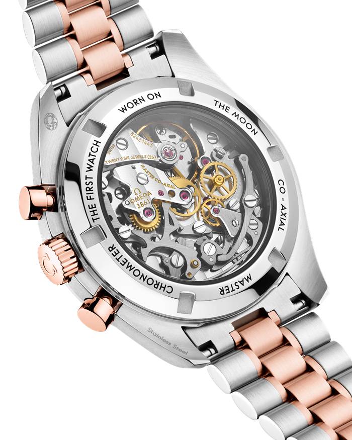 This 42 mm bi-colour model in stainless steel and 18K Sedna™ Gold features sapphire crystal glass on the front as well as on the caseback. Inspired by the 4th generation Speedmaster style worn on the moon, it includes an asymmetrical case with a black ceramic bezel ring, with its tachymeter scale and famous “dot over ninety” in OMEGA Ceragold™.
