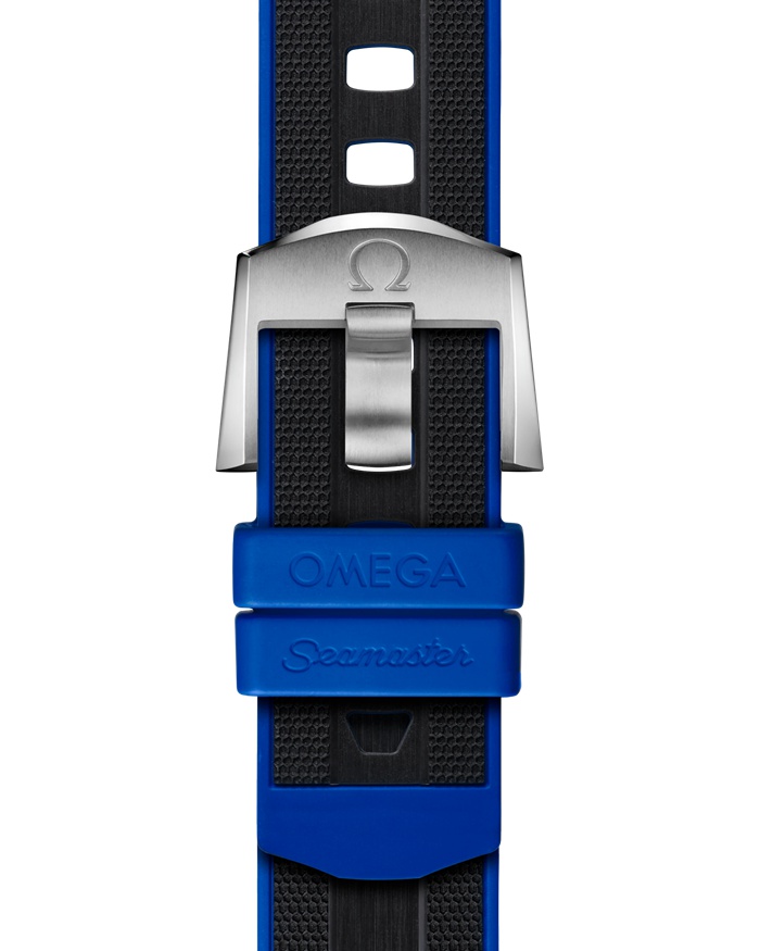 This 45.5 mm model in robust O-MEGASTEEL features a polished blue ceramic bezel with its diving scale in white enamel. Through the protuberant and domed sapphire crystal, the lacquered white dial has been given four Arabic numerals in blue, as well as 18K white gold hands and hour markers, which are all coated with white Super-LumiNova.